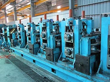 Raw material (Steel Strip) in form of a coil is uncoiled and feed into forming section passing through the equipment of entry section. Entry section enables the pipe mill to run continuously by using strip joining and accumulation equipment. Pipe is formed in round shape passing through a set of driven and idler rollers of forming section before welding. In welding section pipe is longitudinally welded by using high frequency induction welding method. Outside bead is removed and formed in shape of scrap. The weld seam is ironed and pipe passes through the cooling section. In sizing section, pipe is formed to specified size and converted into specified shape. After sizing, pipe is cut to specified length by using flying cutting equipment and delivered in collecting troughs passing through run out conveyor.