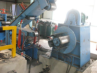 The uncoiler comprises a double expanding mandrel design and serves to unwind the coils with controlled uncoiling tension. The two expanding mandrel uncoiler can be adjusted symmetrically relative to the strip centre line. The adjustment is effected hydraulically